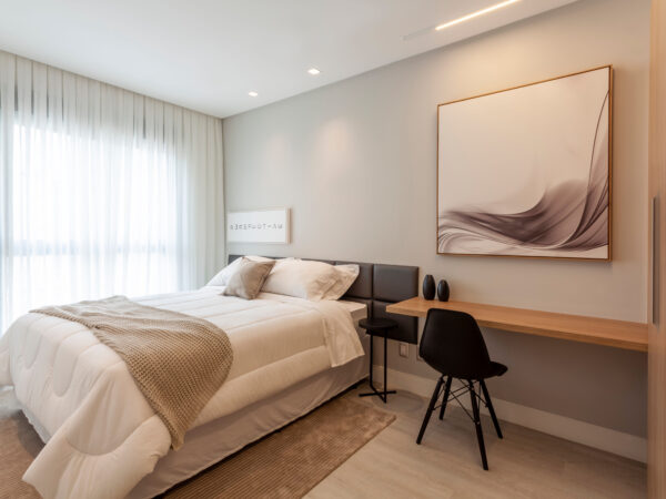 A segurança e a praticidade também são prioridades no design dos apartamentos. As unidades possuem fechaduras eletrônicas, proporcionando um nível adicional de proteção e comodidade no dia a dia. As persianas automatizadas, quando instaladas, oferecem mais conforto e controle sobre a luminosidade dos ambientes. Com todos esses recursos, os apartamentos não apenas garantem um alto padrão de qualidade, mas também um estilo de vida moderno e confortável para os moradores.