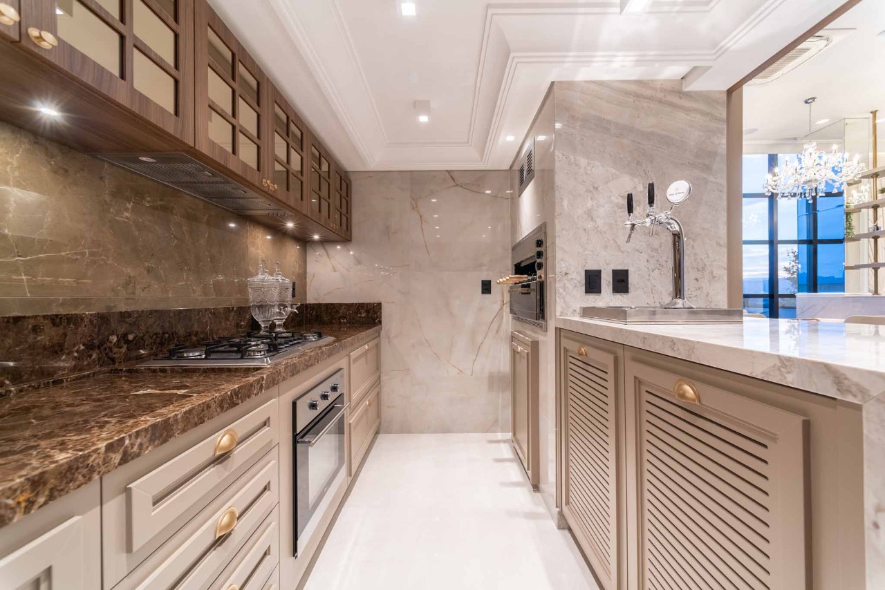A cozinha é bem equipada e conta com tubulação para água quente e ar-condicionado, oferecendo um espaço prático e agradável para preparar suas refeições. A área de serviço é separada da cozinha, proporcionando um ambiente organizado e eficiente para as tarefas domésticas, mantendo a ordem e o conforto em todo o apartamento.