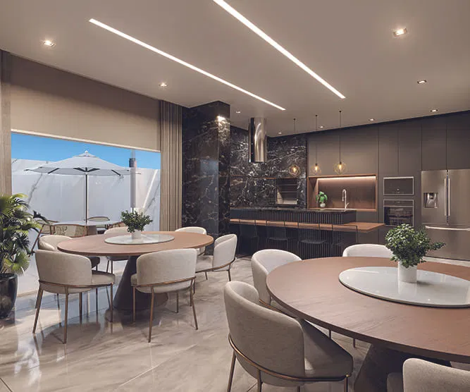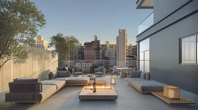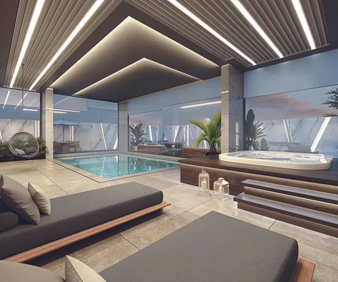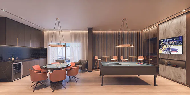 O empreendimento se destaca pela infraestrutura completa, com fachada pastilhada e hall de entrada decorado. Sua área de lazer de 850 m² conta com ambientes mobiliados, como salão de festas, espaço gourmet, sala de jogos e quadra poliesportiva, além de áreas voltadas ao relaxamento, como sala de massagem, spa e piscinas. Para as famílias, o prédio oferece brinquedoteca e playground, garantindo diversão e segurança para as crianças.