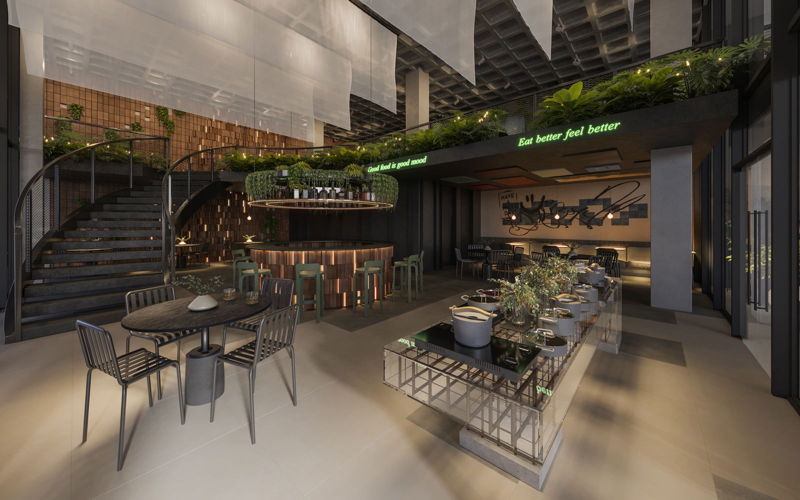 Os interiores são projetados para serem versáteis e adaptáveis, com planos abertos que incentivam a fluidez entre os diferentes ambientes. As áreas de estar e jantar fluem suavemente para os terraços privativos, criando espaços ideais para o entretenimento e para o relaxamento ao ar livre. Cada apartamento é equipado com acabamentos sofisticados e sustentáveis, como pisos de madeira de origem responsável, bancadas em materiais reciclados e sistemas de iluminação de baixo consumo energético.