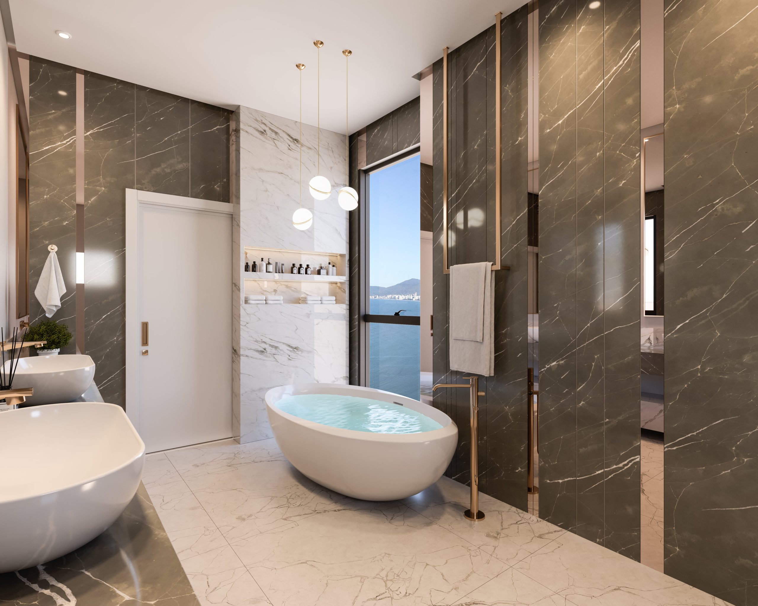 O projeto dos apartamentos inclui detalhes meticulosos como o rodapé personalizado e tetos com acabamento em gesso, prontos para receber diversos tipos de projetos de decoração e iluminação. As portas são equipadas com amortecedores de impacto e dobradiças com rolamentos, garantindo uma abertura suave e sem rangido. Os sanitários são modernos, com vazões de 3 e 6 litros e tampos com sistema anti-impacto, enquanto a infraestrutura interna é pensada para facilitar a integração com tecnologias avançadas. Há esperas para sistema de aspiração central, automação residencial para som ambiente, home theater e climatização, além de aquecimento de água a gás nas torneiras e duchas das suítes, sacada e cozinha.