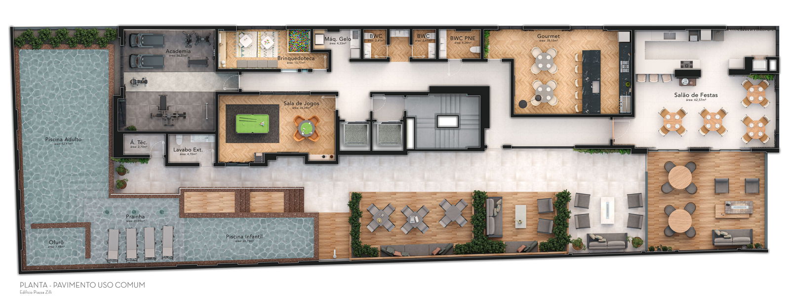 A praticidade também é uma característica marcante deste imóvel, com três vagas de garagem garantindo comodidade e segurança para você e sua família. O layout cuidadosamente planejado inclui áreas comuns que oferecem uma variedade de opções para lazer e convivência, proporcionando um equilíbrio ideal entre conforto e diversão. Esses espaços são perfeitos para relaxar ou socializar, ampliando ainda mais a experiência de viver no Piazza Zilli.