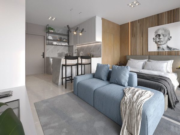 O design interior foi planejado minuciosamente para otimizar o espaço, garantindo uma sensação de amplitude e eficiência. A sala de estar integrada à cozinha forma um ambiente harmonioso e acolhedor, perfeito para momentos de convívio e descontração. As amplas janelas permitem a entrada de luz natural abundante, realçando os elegantes acabamentos como pisos de porcelanato e bancadas de granito. Este é um espaço onde estilo e conforto se combinam, proporcionando um lar moderno e aconchegante.