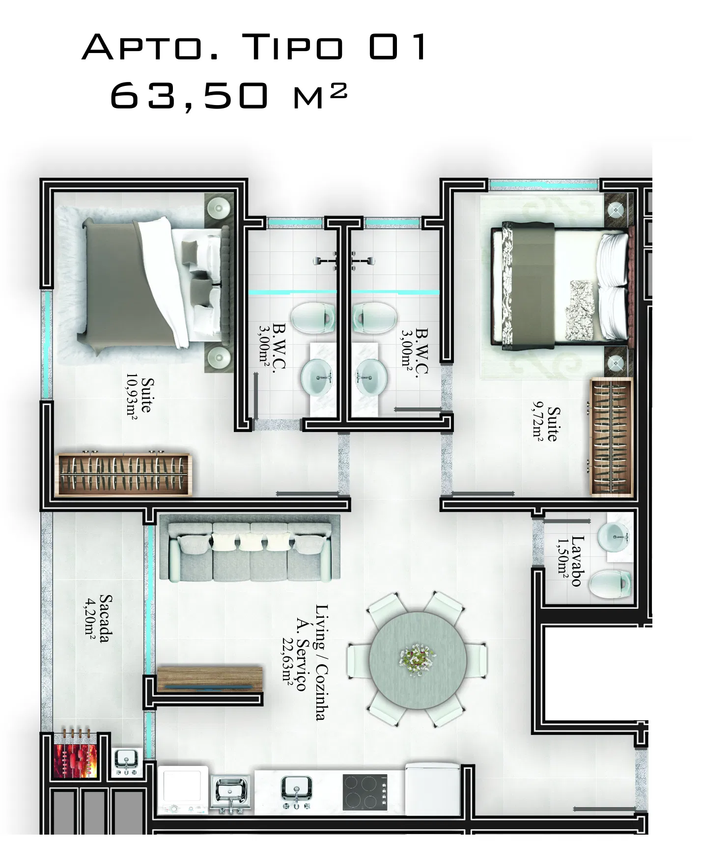 Cada unidade é projetada com acabamentos em gesso que conferem um toque de elegância aos ambientes. O piso em porcelanato adiciona um ar de requinte e facilita a manutenção, enquanto o living amplo e integrado oferece um espaço ideal para a convivência e recepção de visitas. A sacada, equipada com churrasqueira, é perfeita para momentos de lazer ao ar livre e para preparar refeições ao estilo de um verdadeiro churrasco.