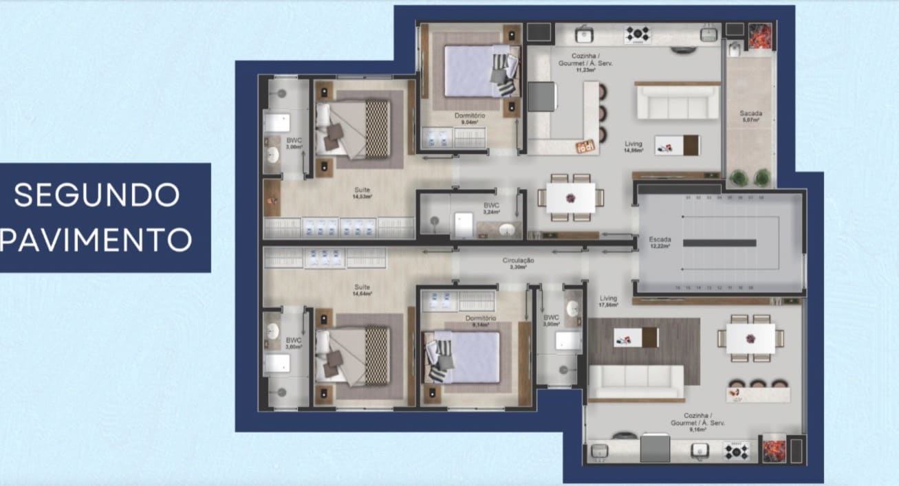 Os ambientes internos incluem um living aconchegante, salas de estar e jantar bem iluminadas, e uma varanda gourmet, perfeita para relaxar ou receber convidados. O piso em porcelanato adiciona um toque de sofisticação ao espaço, reforçando o padrão de qualidade do Residencial Caminhos do Mar, que une modernidade e tranquilidade em uma localização privilegiada.
