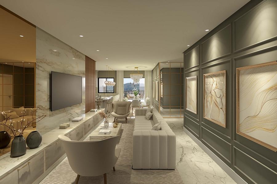 O acabamento interno é um exemplo de qualidade e elegância: o piso em porcelanato é utilizado em áreas como o living, sacada, cozinha, área de serviço, banheiros e lavabo, proporcionando uma superfície resistente e de fácil manutenção. Nos dormitórios, o piso vinílico é escolhido por sua excelente qualidade de acabamento, estético e desempenho acústico e durável. O rodapé personalizado complementa o design, conferindo um toque de sofisticação adicional.