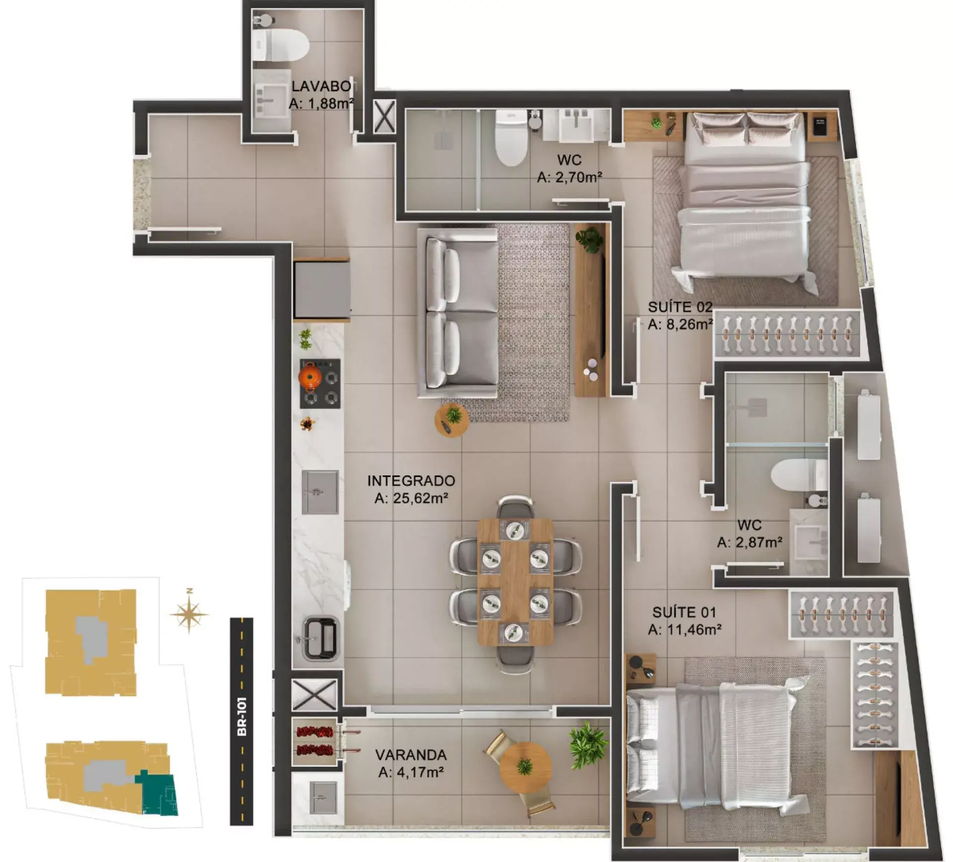 Este apartamento é uma verdadeira joia para quem busca um lar que combine modernidade e conforto em cada detalhe. Com suas duas suítes espaçosas, o imóvel oferece o máximo de privacidade e descanso, com ambientes cuidadosamente planejados para criar uma atmosfera acolhedora e sofisticada. As suítes são banhadas por luz natural, com grandes janelas que trazem a beleza do exterior para dentro, criando um ambiente perfeito para relaxar após um dia intenso.