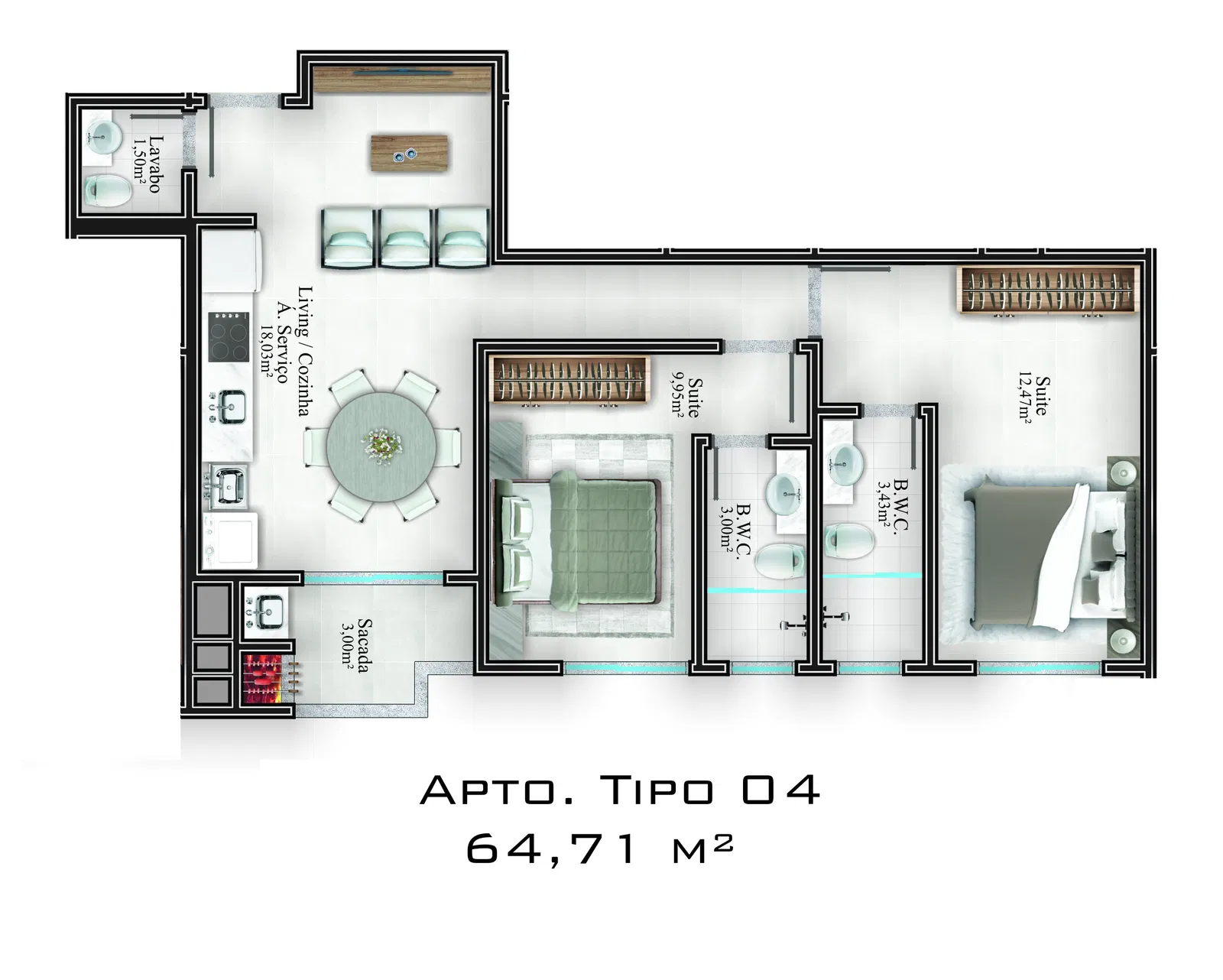 Cada unidade é projetada com acabamentos em gesso que conferem um toque de elegância aos ambientes. O piso em porcelanato adiciona um ar de requinte e facilita a manutenção, enquanto o living amplo e integrado oferece um espaço ideal para a convivência e recepção de visitas. A sacada, equipada com churrasqueira, é perfeita para momentos de lazer ao ar livre e para preparar refeições ao estilo de um verdadeiro churrasco.